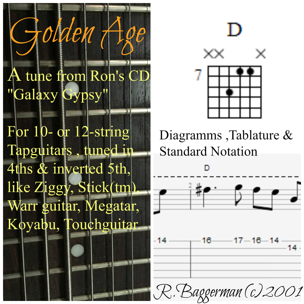 "The Golden Age" is an original composition by Ron Baggerman of his "Galaxy Gypsy"CD, released in 2001. The download consists of the Score/Tab/Guitarpro/Audio files for 10- or 12-string Tapguitars like The Chapman Stick (tm), Ziggy, Koyabu, Warr Guitar, Krappy Guitar, etc.